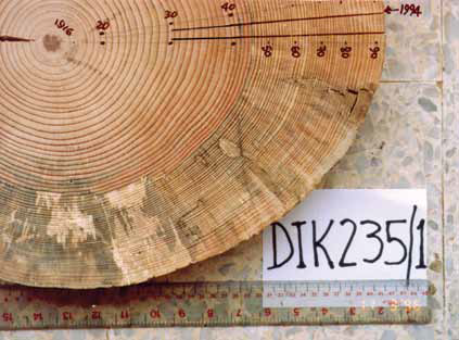 | Figure 1b: Cross-section of Thai three-leaf pine tree DIK 235/1 with rings from 1916 to 1994, from which a sub-section was used for AMS 14C analysis. |